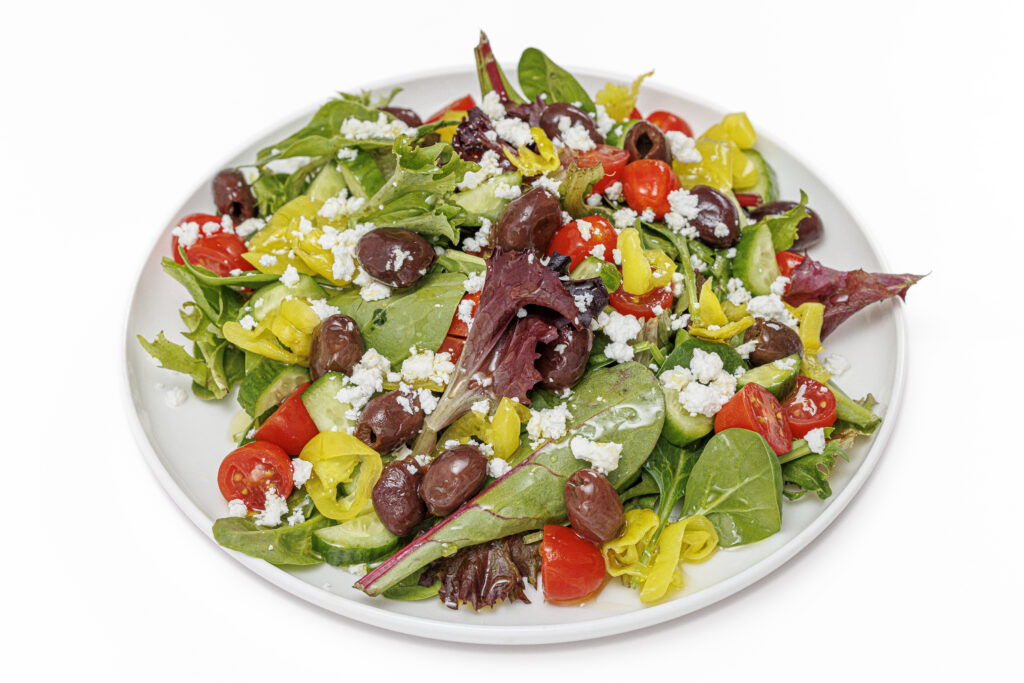 Spring Mix, Cucumbers, Cherry Tomatoes, Pepperoncini, Feta Cheese, Kalamata Olives & Greek Dressing.