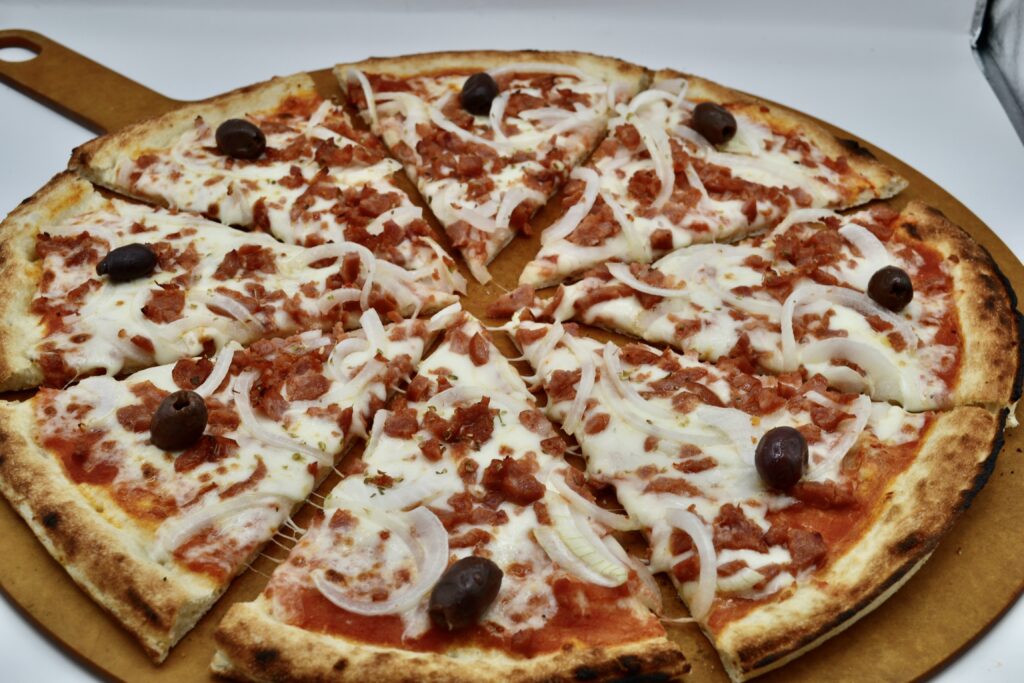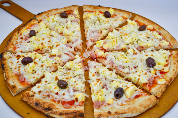 Tomato Sauce, Mozzarella, Ham, Hard Boiled Eggs, Onions & Black Olives.