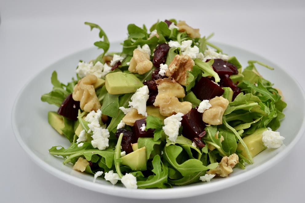 Arugula, Beets, Avocado, Honey Goat Cheese, Dried Cranberries, Walnuts & Balsamic Honey Dressing.