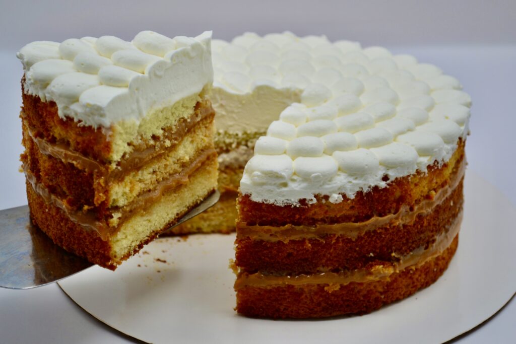 Vanilla Cake, Dulce de Leche Filling & Whipped Cream.